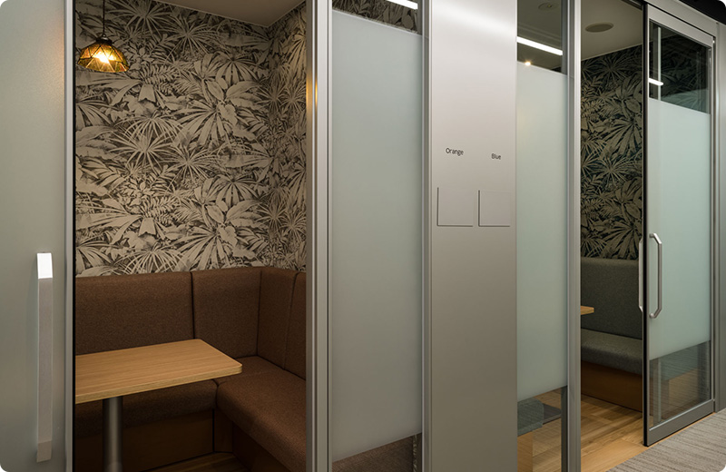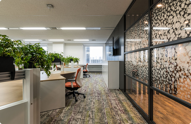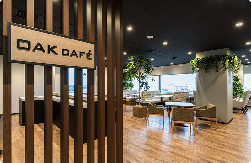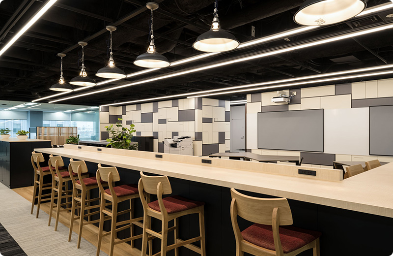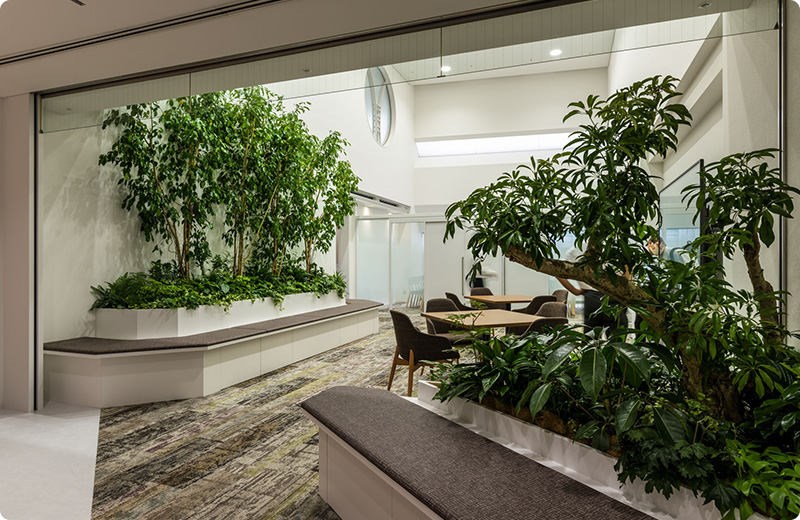 社員が集まれるスペースを増やし、部門の垣根を超えてコミュニケーションがとれるよう計画。グリーンをふんだんに使用し照明を変えることで、メリハリのある空間となっている。