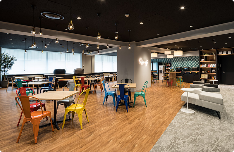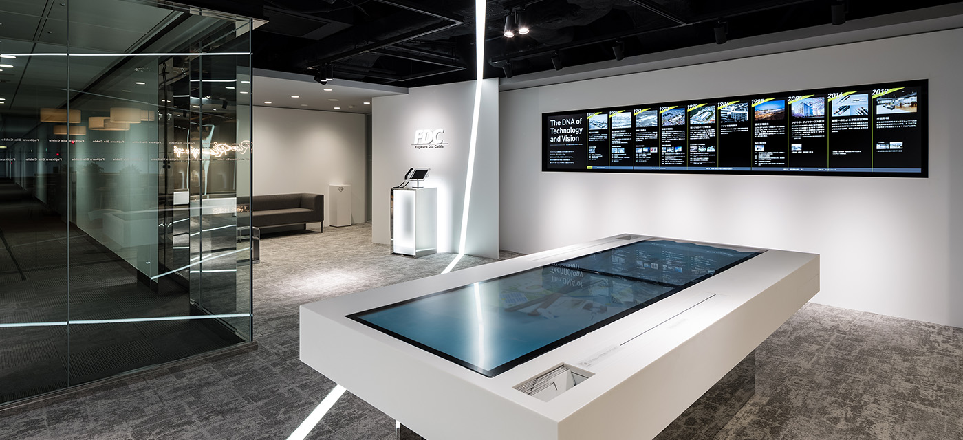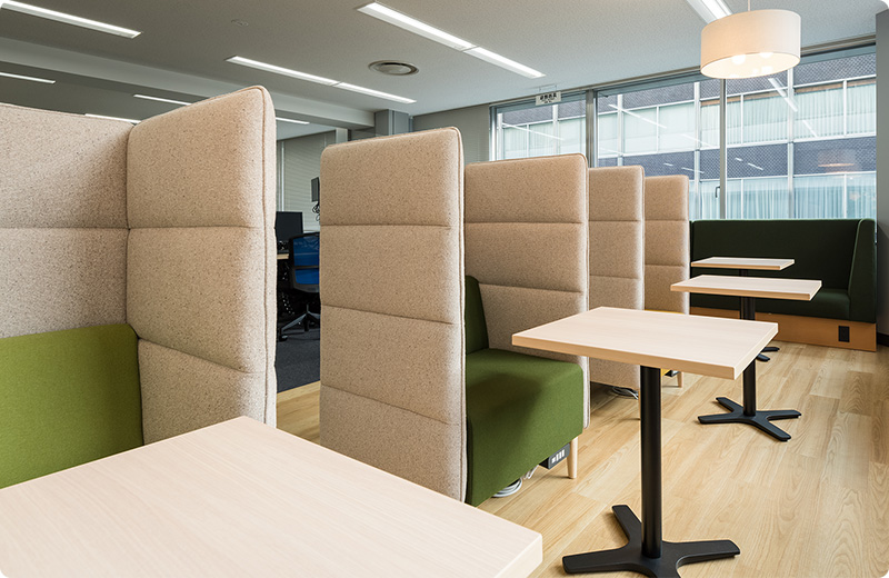 社員同士の横と縦のコミュニケーションを活性化させるカフェスペースや、可変性のあるグリッドレイアウトに社員が選んだインテリアを盛り込んでいる。エントランスには、歴史と商品の情報をインタラクティブに取得できるタッチパネル型ショーケースを設置し、ご来社されるお客様や社員に向けて企業の魅力を伝えている。